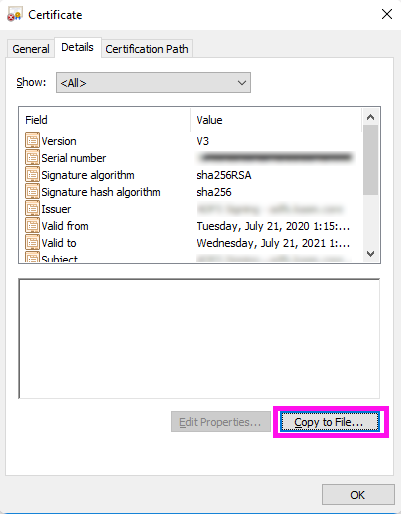 - From the Certificate dialog box, click the Details tab.