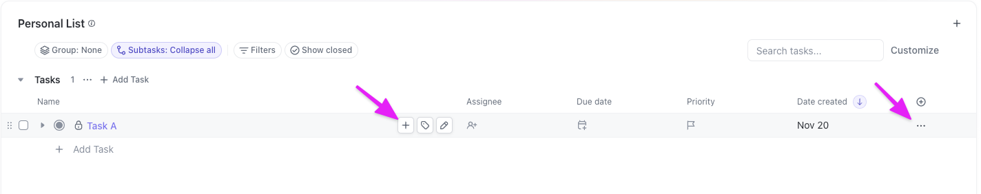 - Add subtask: Create a subtask.